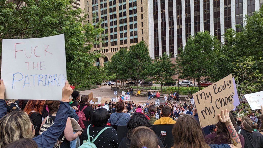 The largest protest was organized by the Dallas-Fort Worth chapter of the Party for Socialism and Liberation. It drew one hundred people to Dealey Plaza for speeches and a march through the downtown streets. That march made its way to Civic Garden outside the federal courthouse, just a few blocks away from the building where the original Roe v. Wade case was argued.